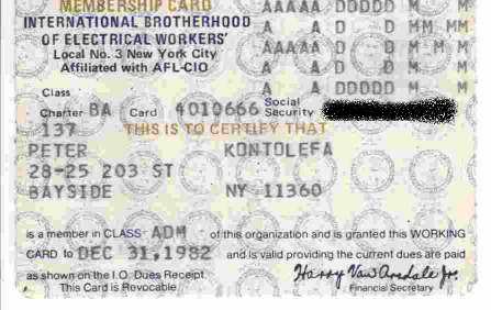When Peter got his Union Card, he seemed wistful, and he told us a story from his youth. After graduating high school he wanted to work in the electrical field either in radio or as an electrician, but it was the depths of the Great Depression. His mother worked as a domestic in several households after Peter's father died, and one of the households was of a well off family who's head was active in local Democratic Politics. Philanthe took care of the children, they called her "Yiaya" and was treated as one of the family. She asked a favor of the head of the household to made inquiries about the Electricians Union. He agreed effusively, and said he was sure something could be worked out. About a week later, Peter was called to his office (he remembers dressing in a suit and tie to meet his mother's employer.) The official was very somber, and told Peter that he had met with some guys he disdainfully (he was Irish American) called "Mafia Men". He said that if Peter could pay them $1500, he could get into the union and he strongly urged him to raise the money if he could. (Electricians were making $3.00/hr even during the depression.) In those days $1500 was a lot of money, so he never mentioned the offer to his mother or anybody else.